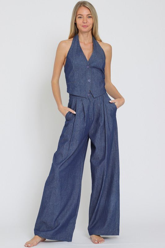 Bead Cowl Neck Halter Wide Leg Jumpsuit