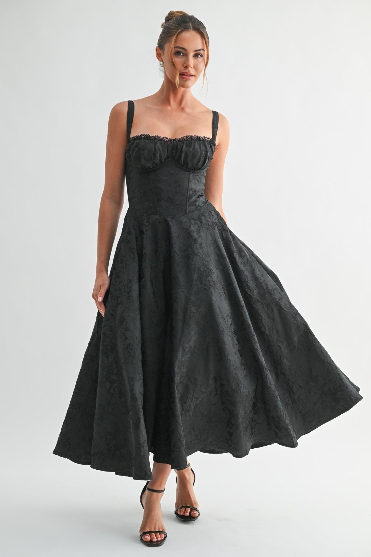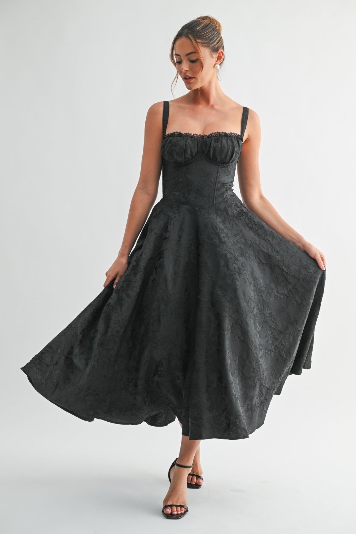 A romantic silhouette with intricate detail, the Fleur Corset Midi Dress features a structured bodice with shaped cups and delicate lace trim. Crafted from floral jacquard for rich texture and dimension, it's designed with a lace-up back for a customizable fit. The full A-line skirt adds volume and movement, while adjustable shoulder straps provide support. Finished with a discreet side zipper.