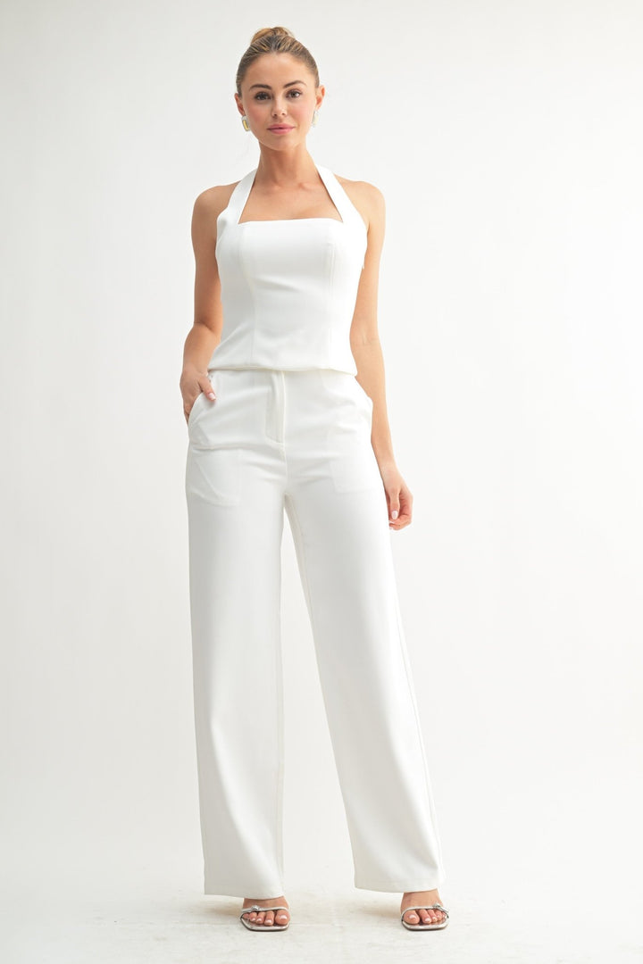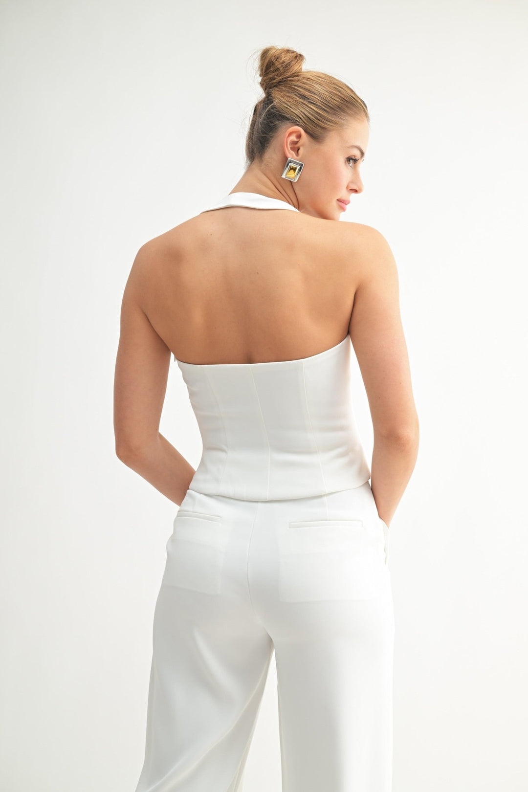 Upgrade your wardrobe with our sleek halter neck top. Featuring a modern square-cut neckline and tailored fit, this versatile top flatters your silhouette. With a secure zip closure, it pairs perfectly with our Wide-Leg Trousers for a polished, coordinated look. Available in multiple colors and pre-order options.