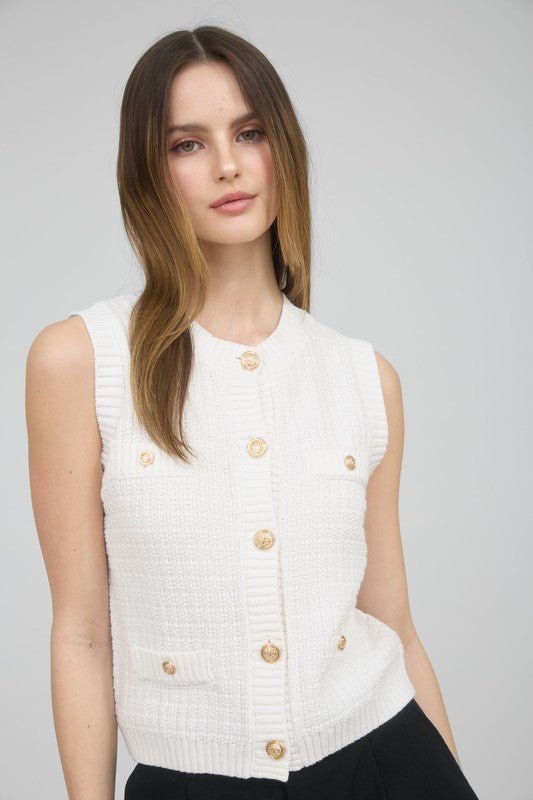 Gold Button Sleeveless Pocket Detail Knit Cardigan