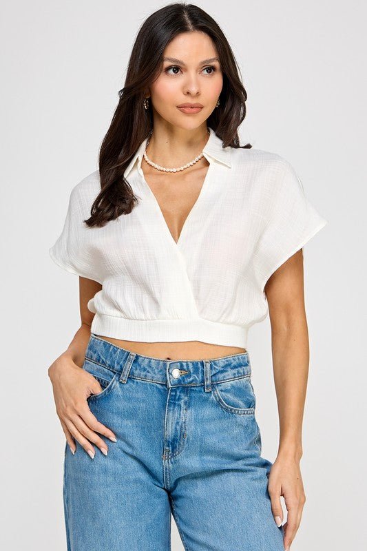 Striped Collared Short Sleeve Crop Top