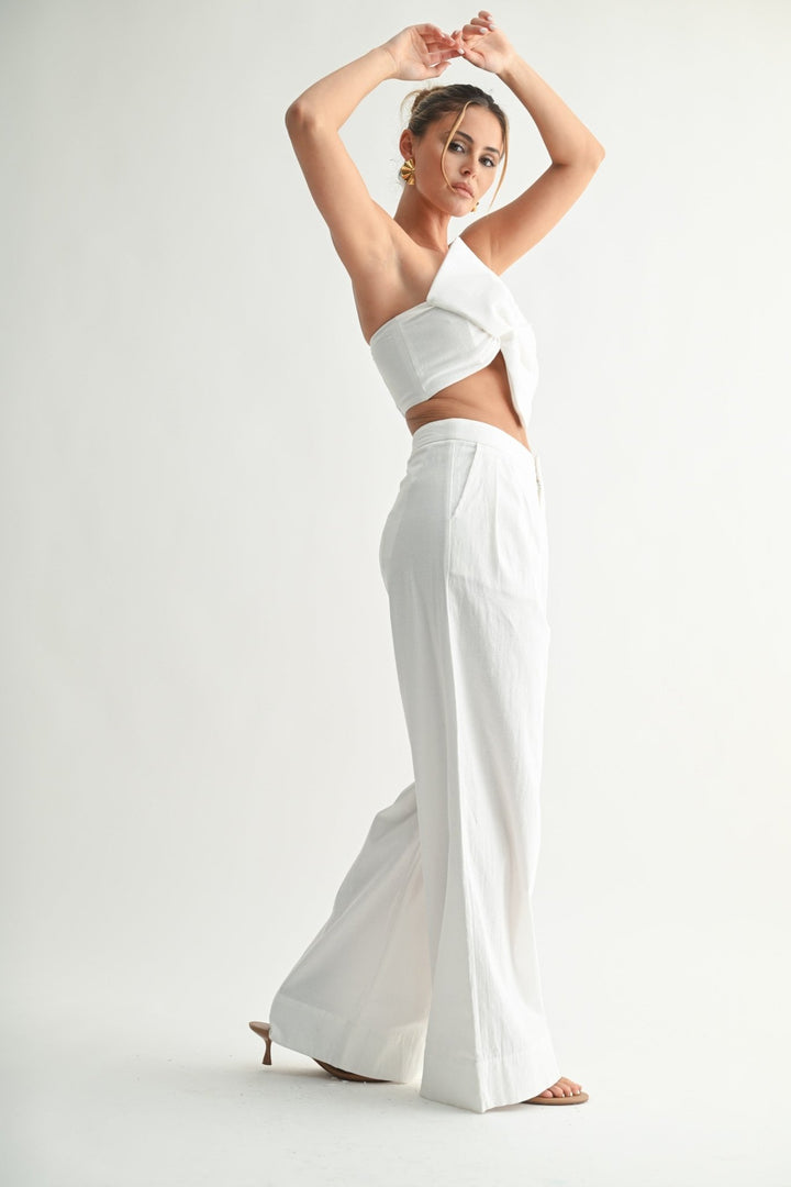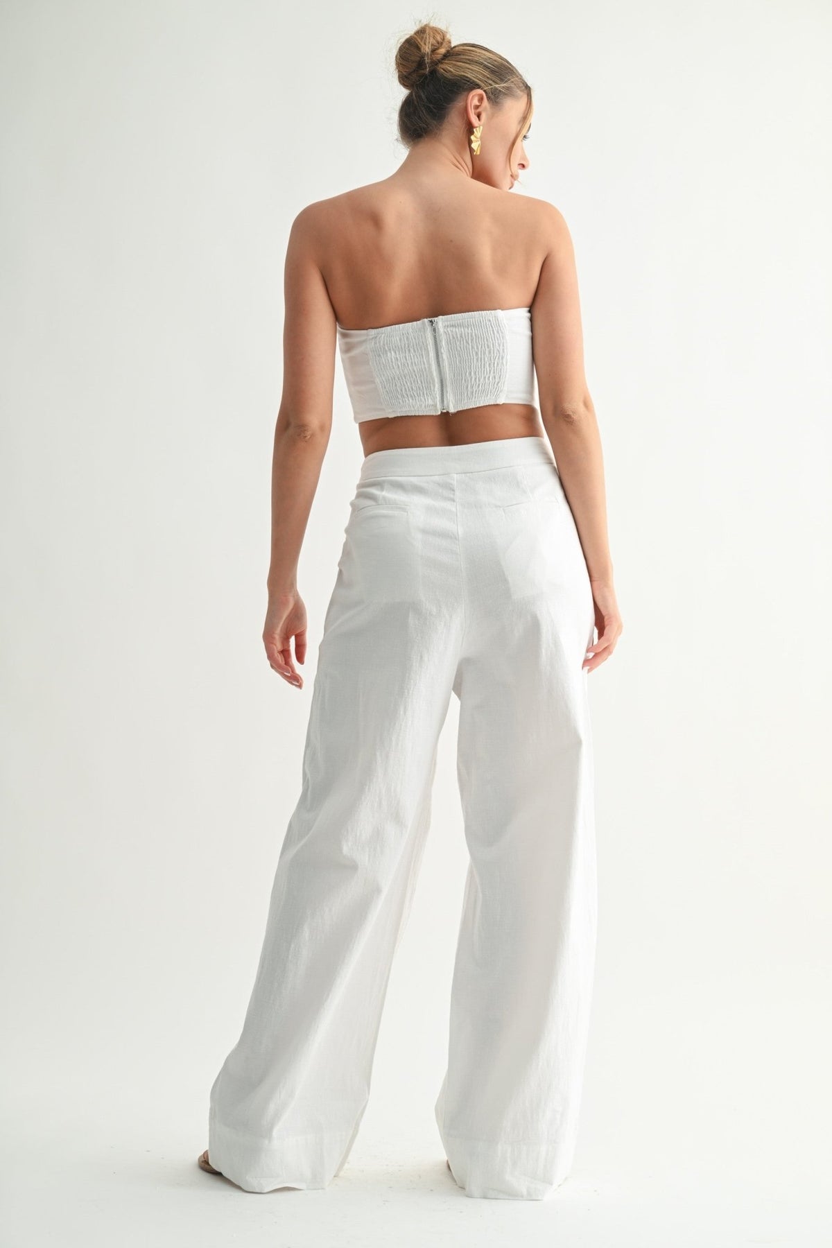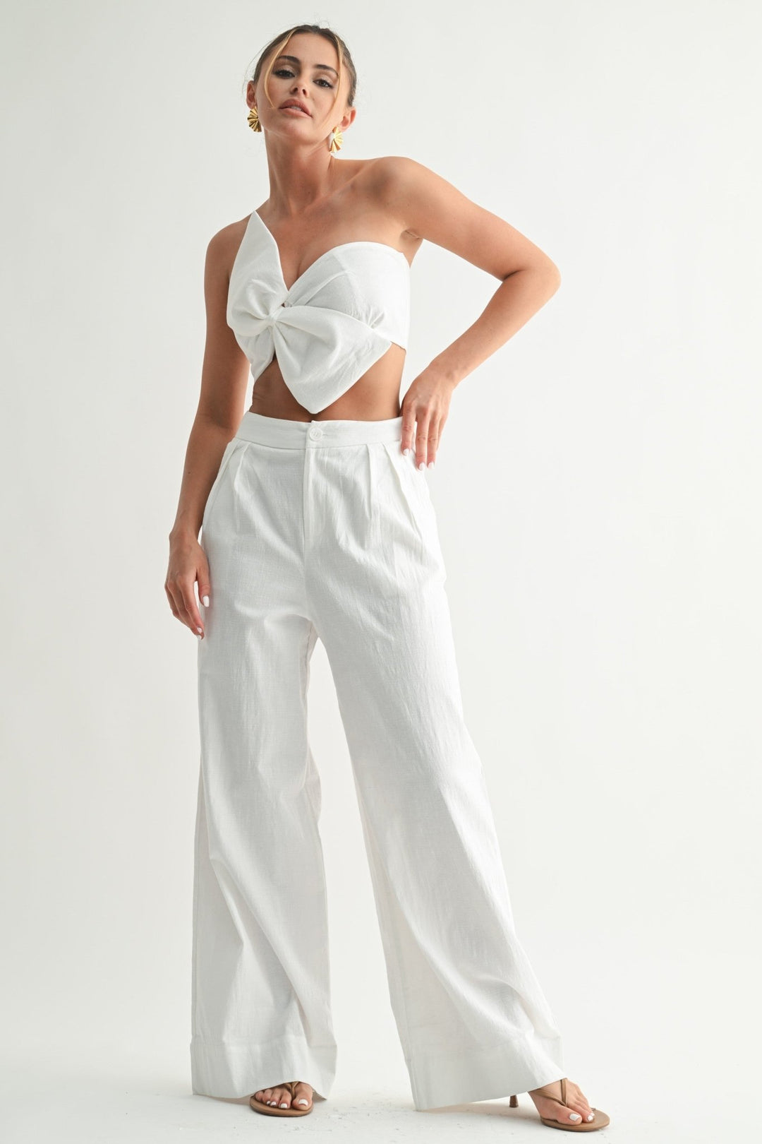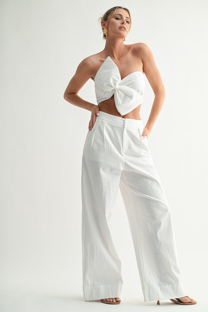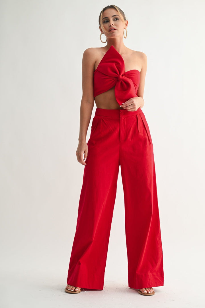 Effortlessly exude elegance with the Isla Bow Top & Trouser Set. This stunning two-piece is designed for warm-weather sophistication, featuring a bold oversized front bow and strapless neckline for a touch of glamour. The lightweight woven fabric offers breathability and mobility, while the high-waisted trousers with side pockets and subtle pleating add a tailored finish. Perfect for garden parties or resort getaways, this set is available in Red and White and is sure to turn heads. Channel effortless elegance with the Isla Bow Top & Trouser Set. A stunning two-piece designed for warm-weather sophistication. The top features a bold oversized front bow and strapless neckline with a smocked back panel and zipper for a secure yet comfortable fit. The wide leg trousers sit high at the waist, complete with side pockets and subtle pleating for a tailored finish. Made from a lightweight woven fabric that allows for breathability and movement. This standout set is perfect for garden parties, resort getaways, or casual-chic moments. Available in Red and White.