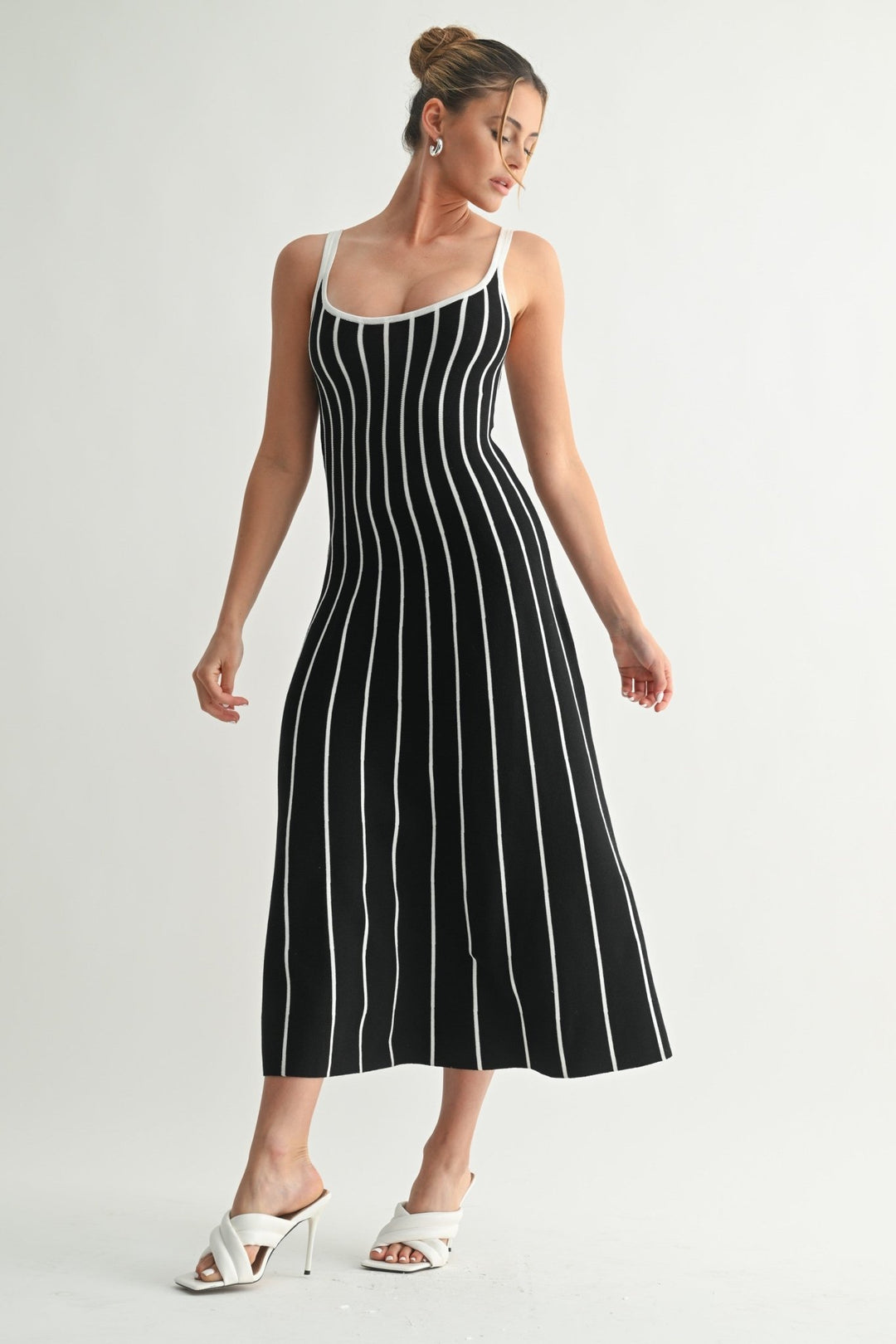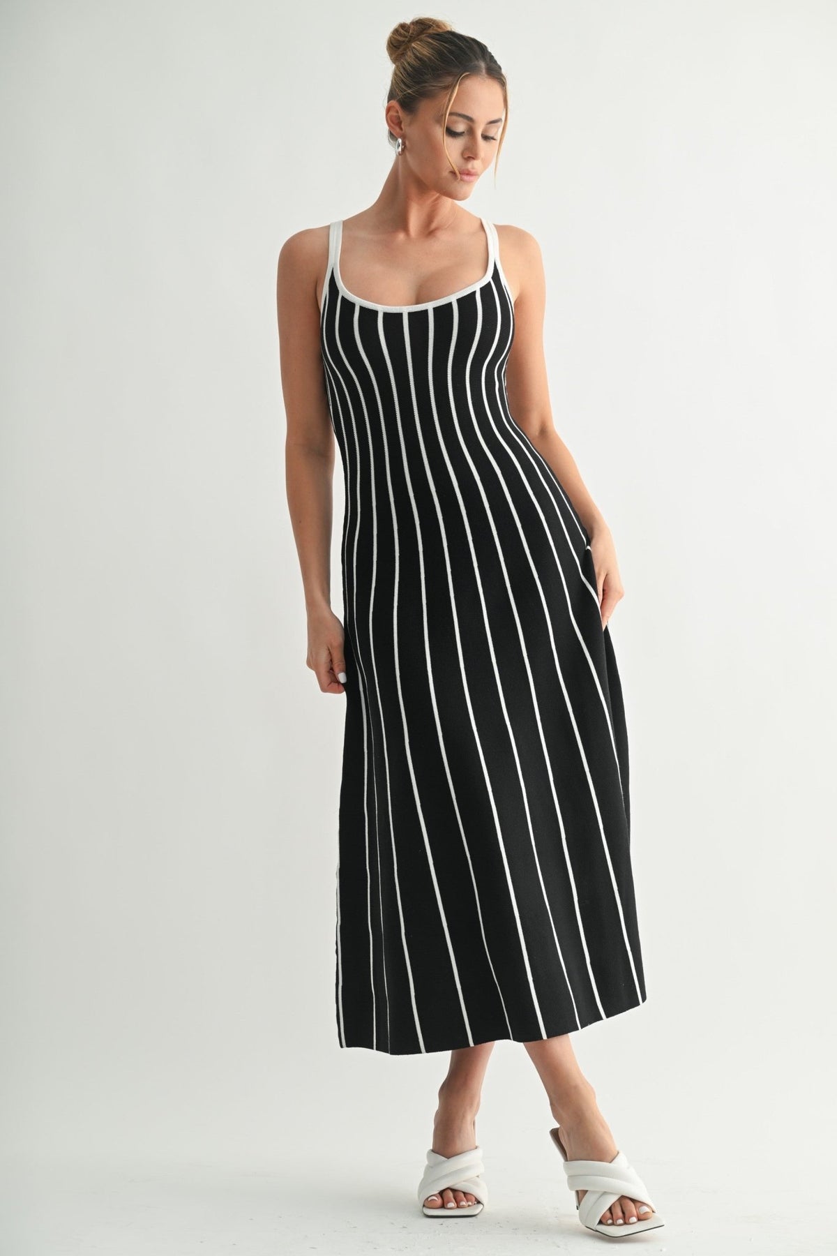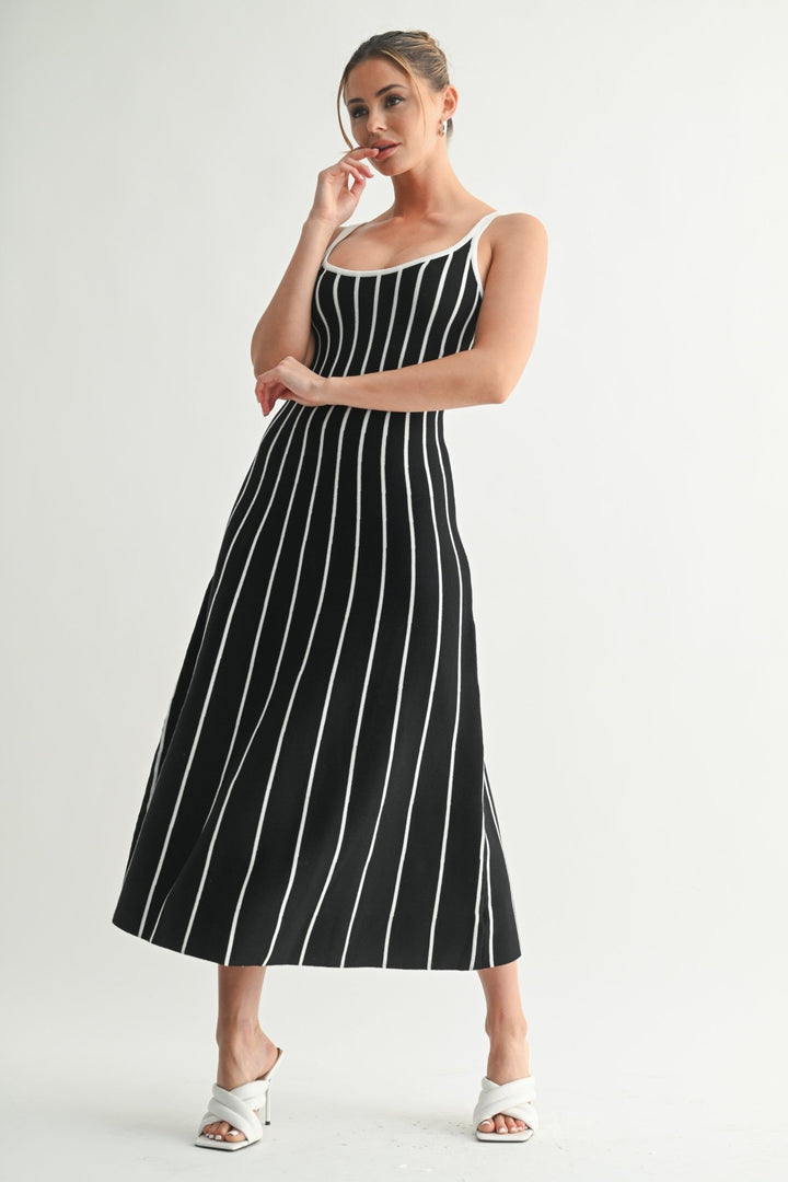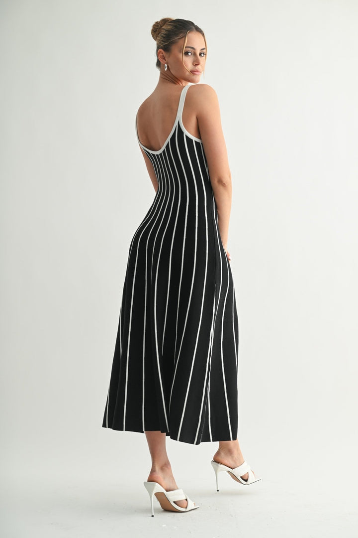 A classic midi silhouette reimagined with bold contrast. The Striped Rhythm Knit Dress features a scoop neckline, slender shoulder straps, and vertical rib-knit striping that elongates the body and flatters every curve. The stretch knit fabric hugs the form before flaring slightly at the hem for easy movement. Style it with heels for an elevated day-to-evening vibe or keep it casual with sneakers or sandals.