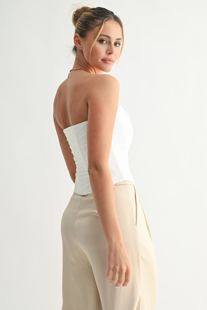 A timeless strapless silhouette with a modern twist, the Whispered Silk Corset Top features delicate ruched layering across the front and a flattering asymmetrical hem. Crafted in a soft satin-like fabric with a structured fit, this top includes an invisible side zipper for ease and a clean finish. This piece pairs effortlessly with tailored trousers or a sleek mini for both elevated and casual styling. Available in Tan and White.