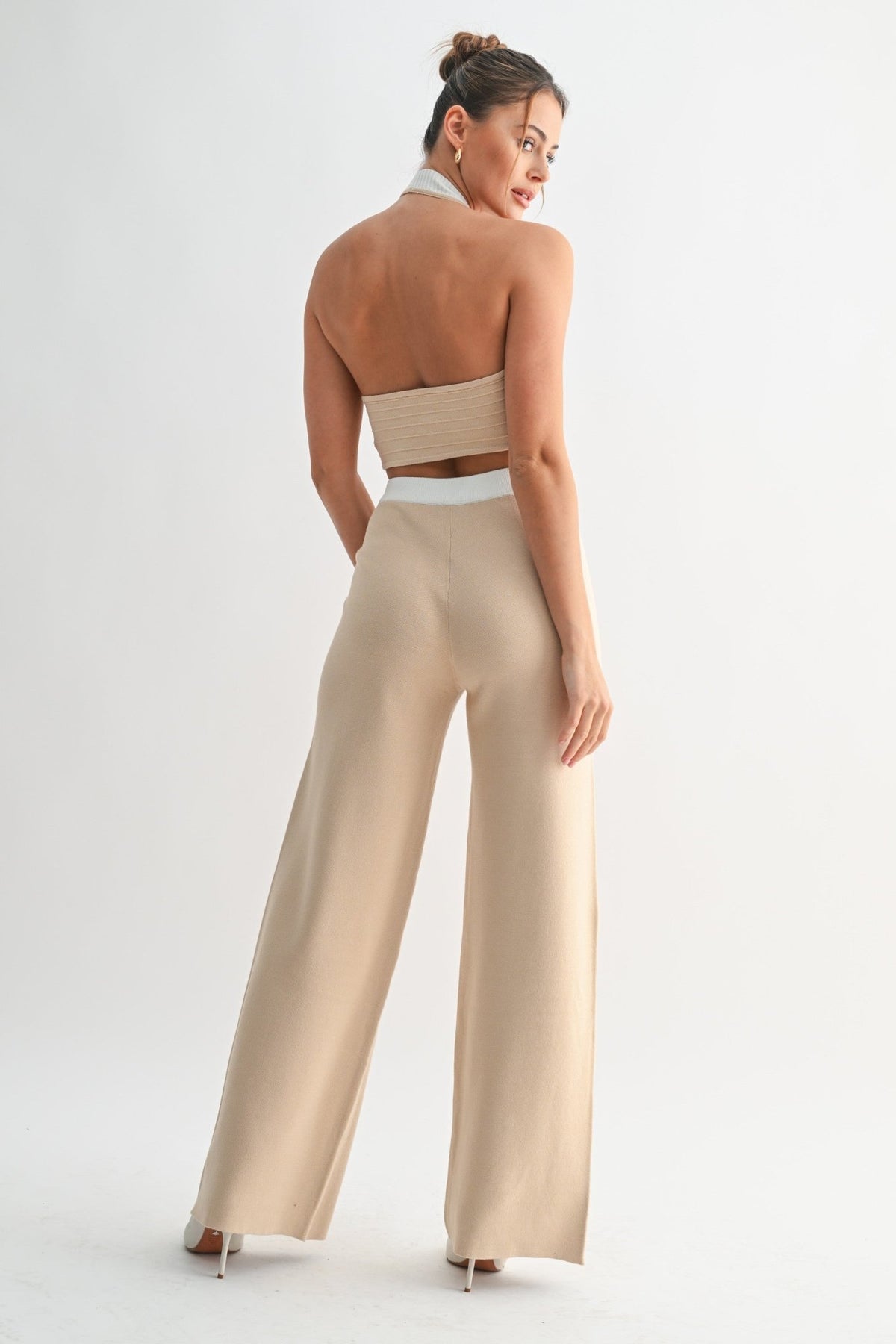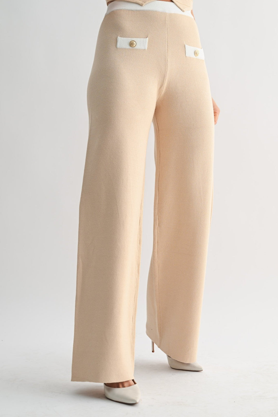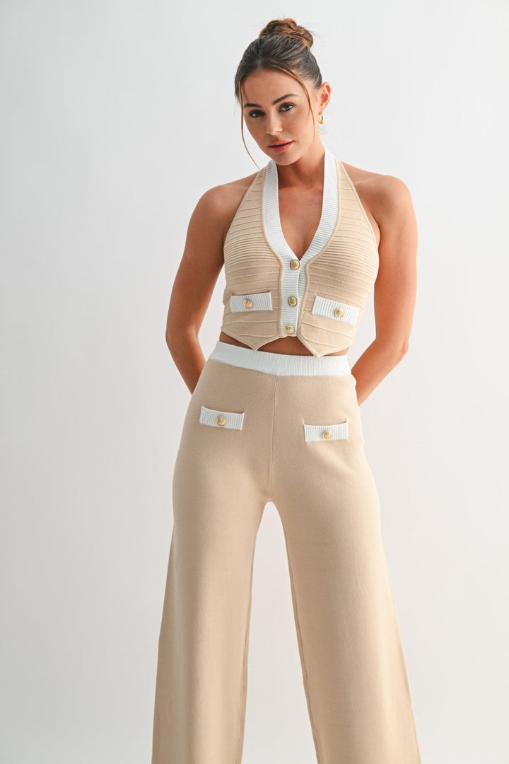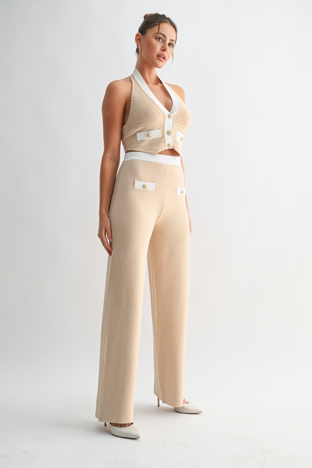 This contrast-trim set blends structure with softness for a polished off-duty look. The halter top features a deep neckline and decorative gold-tone buttons with non-functional flap accents for a tailored feel. The wide-leg knit pants sit high on the waist, finished with a contrast waistband and matching faux pocket details.