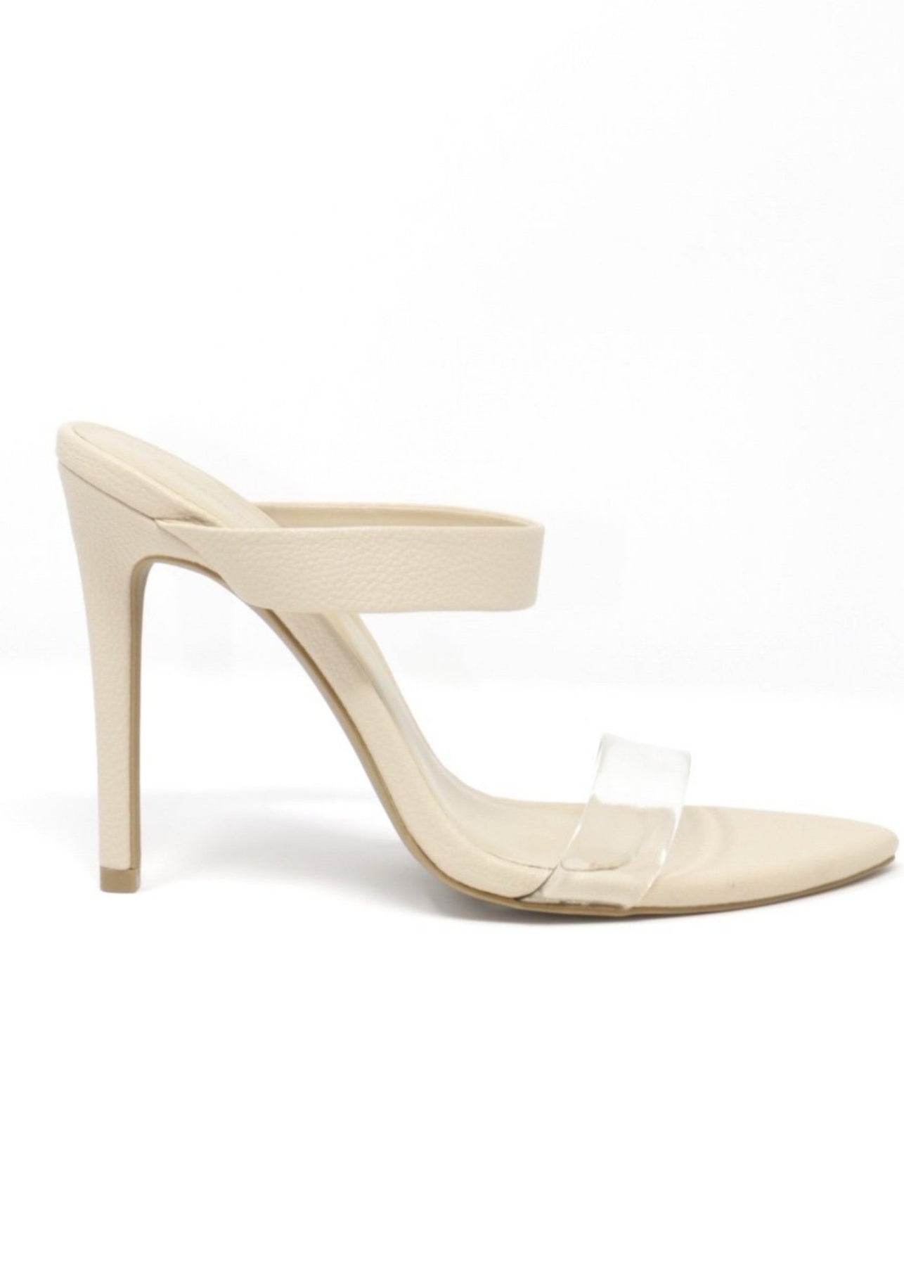 Women's slide-on nude heels, Audrey nude and clear strap heels by Alexandria Brandao Shoes.