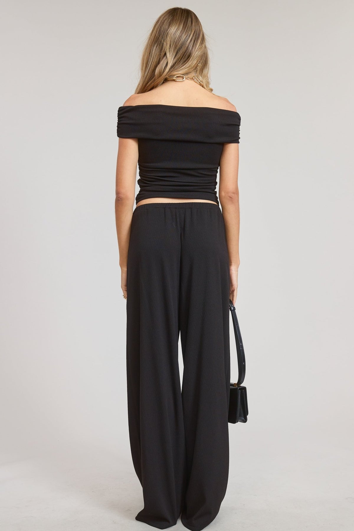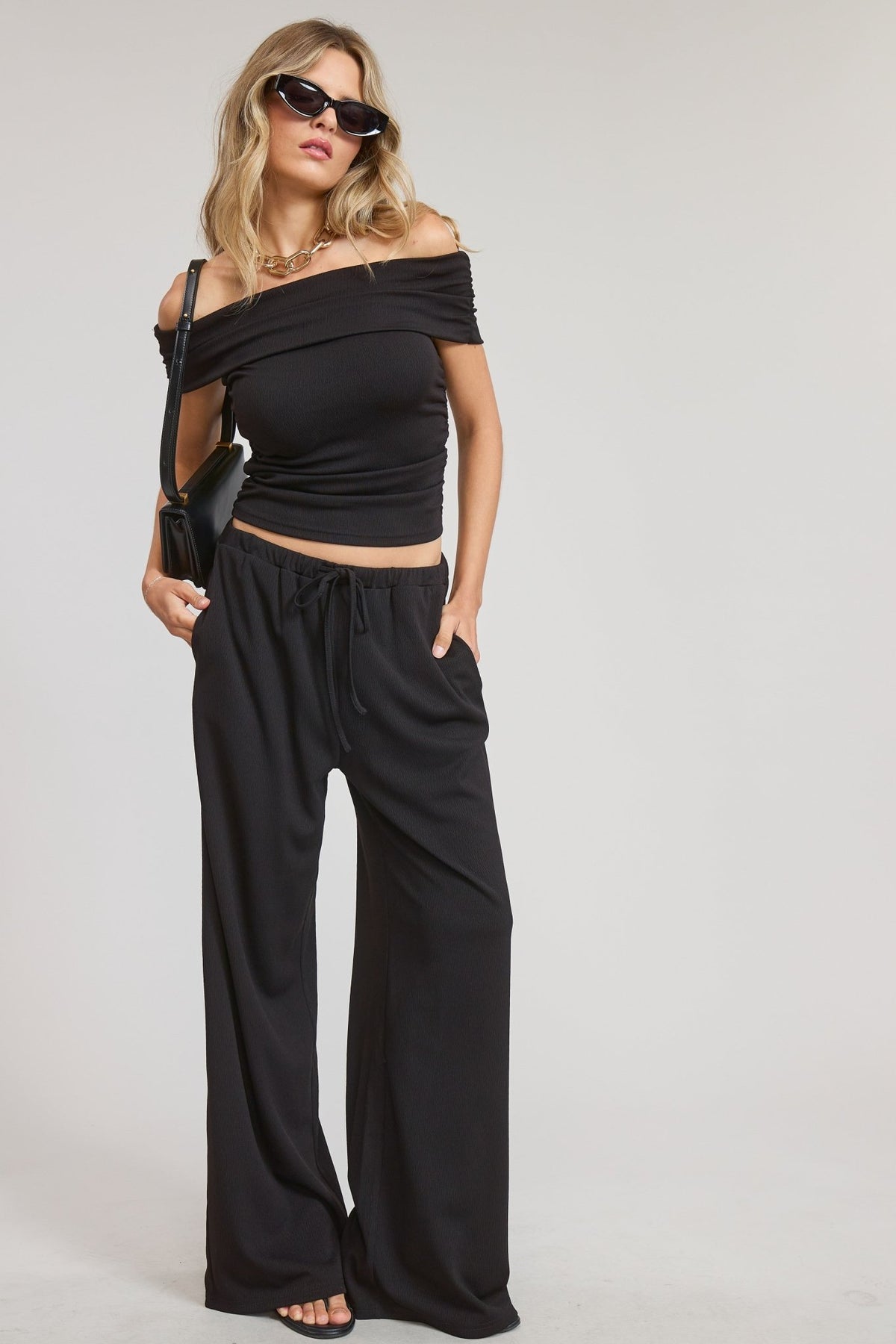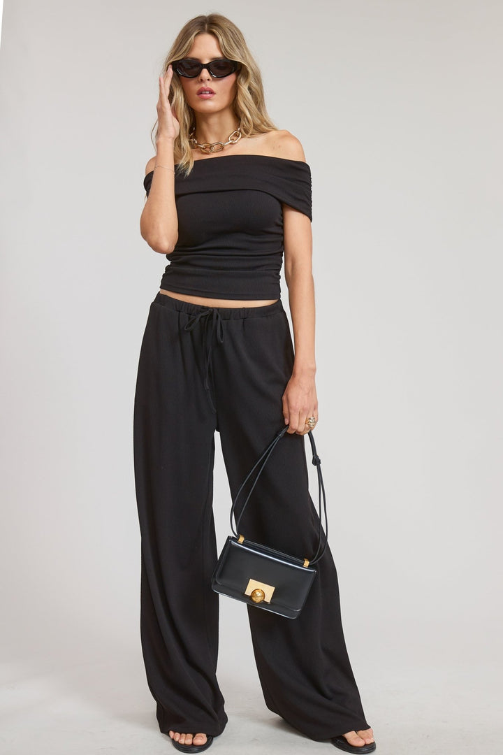 The ultimate blend of comfort and sophistication. This off-shoulder set features a fitted, ruched top that highlights the neckline and shoulders, paired with relaxed wide-leg pants designed with an easy drawstring waist. Whether you're heading to brunch or dressing it up for date night, this all-black set keeps it effortlessly elevated and endlessly versatile.