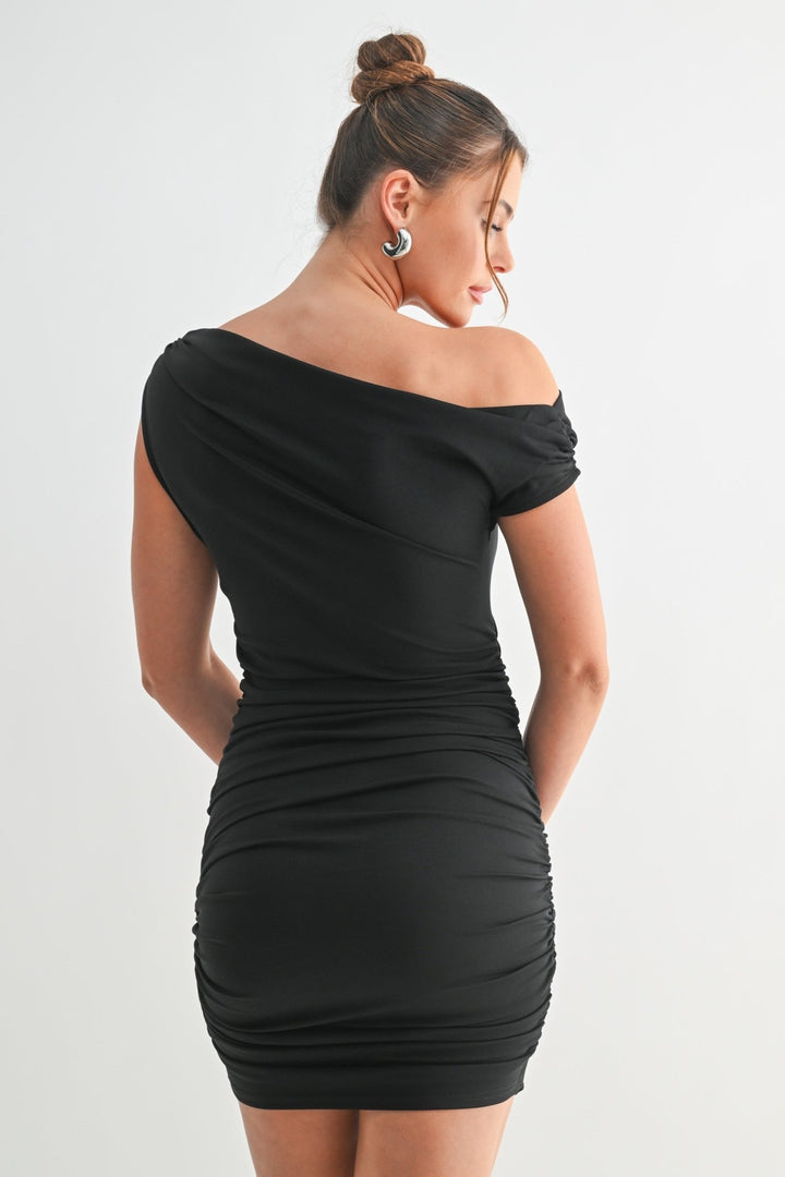 The Sculpted Ease Mini Dress features an asymmetrical off-shoulder neckline and soft ruching throughout for a body-contouring effect. Crafted from a smooth stretch fabric in a rich espresso tone, this mini is your go-to for effortless elegance—whether it’s a dinner date or night out with the girls.