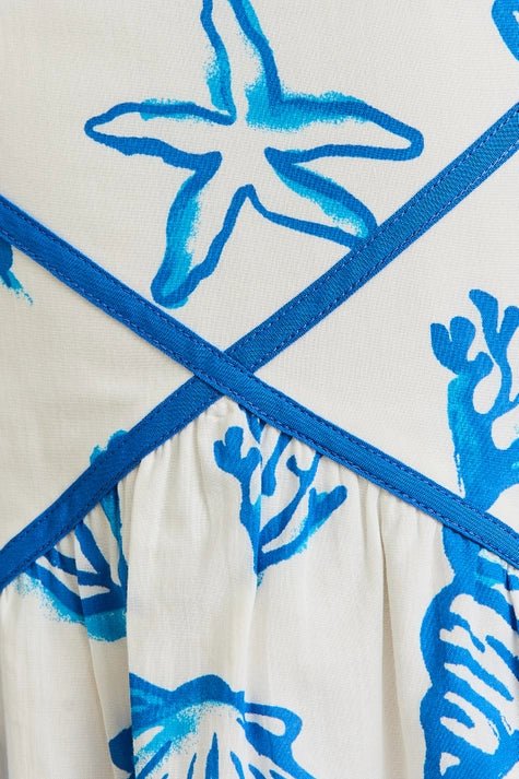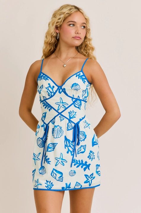 Make waves in this ocean-inspired mini dress featuring a vibrant blue seashell and coral print on a crisp white base. Designed with adjustable spaghetti straps, contrast piping, and a flirty fit-and-flare silhouette, this playful piece is perfect for beach days, tropical getaways, or summer brunches. The flattering bust seam and gathered waist add feminine shape, while the bold print brings vacation-ready vibes. Style it with sandals and shell jewelry for the ultimate seaside look.