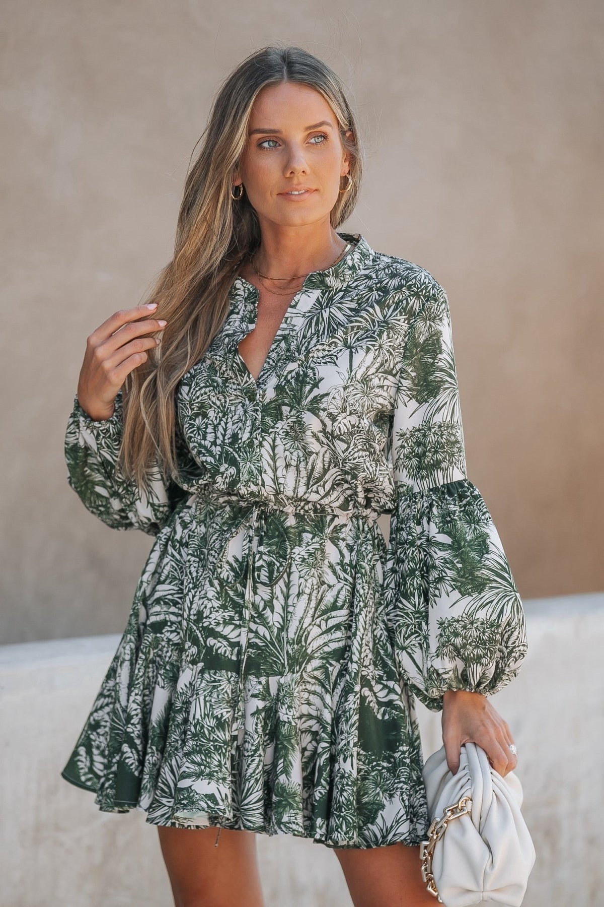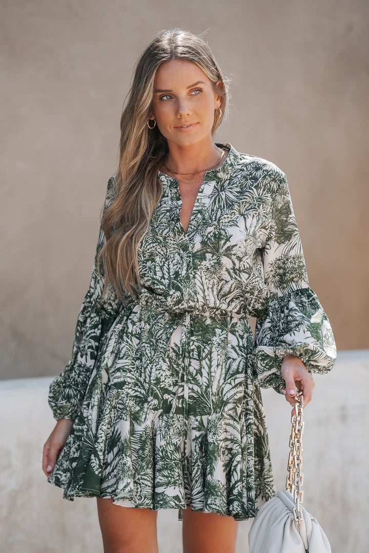Say hello to tropical sophistication with the Costa Rica Print Billowy Fit Mini Dress. This flirty mini features a lush green and ivory jungle print, a flowy tiered skirt, and billowy long sleeves for that effortlessly luxe look. Cinch the waist with the drawstring tie for a flattering fit that works from day to night.