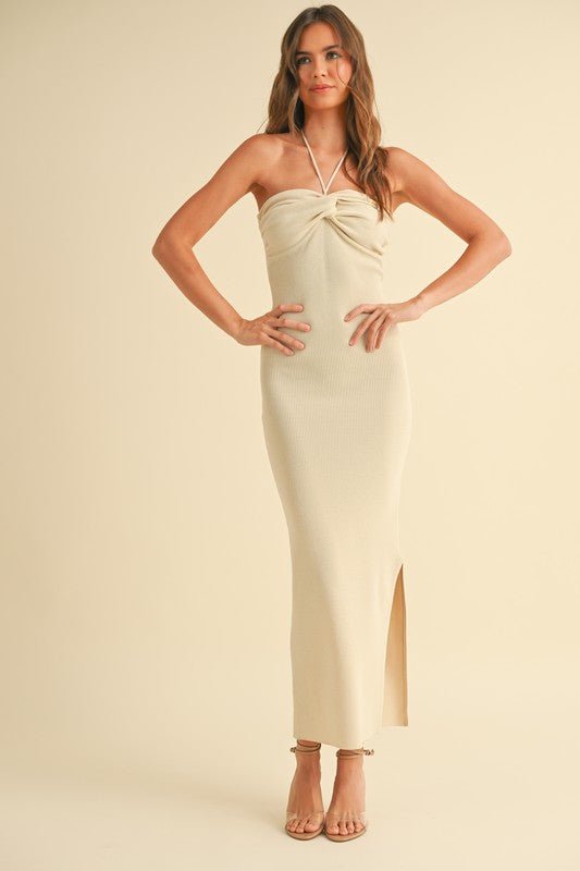 Turn heads effortlessly in this halter twist front ribbed knit midi dress. Featuring a strapless sweetheart neckline with a twist-front detail, this sleek knit hugs the body while offering a flattering, comfortable stretch. The halter strap adds security while keeping the look elevated and feminine. A side slit brings a touch of allure, making this piece perfect for vacation nights, rooftop dinners, summer parties, and everything in between. Available in both timeless black and crisp white.