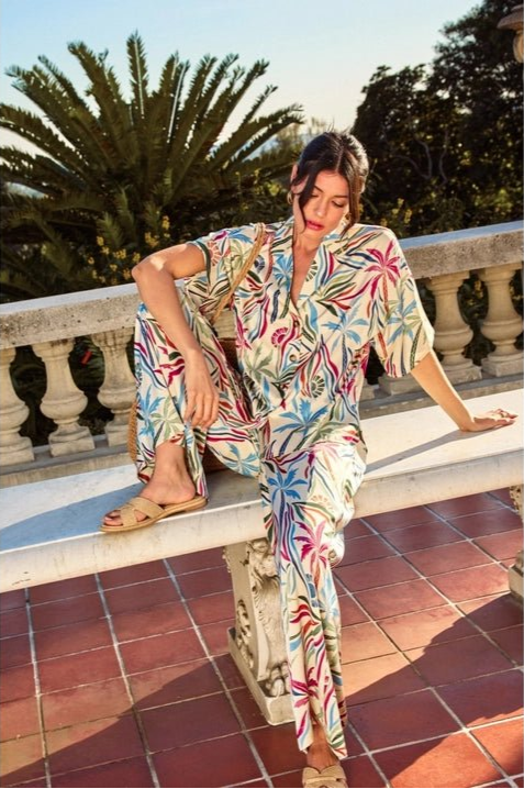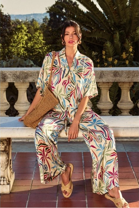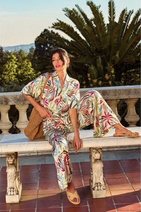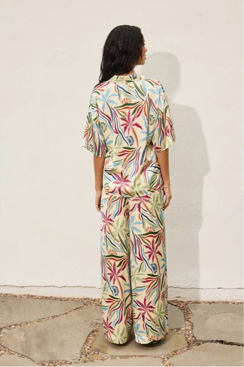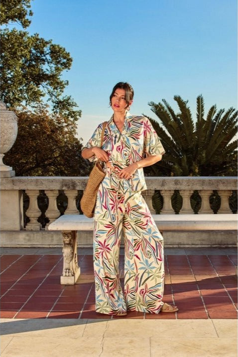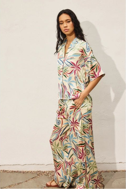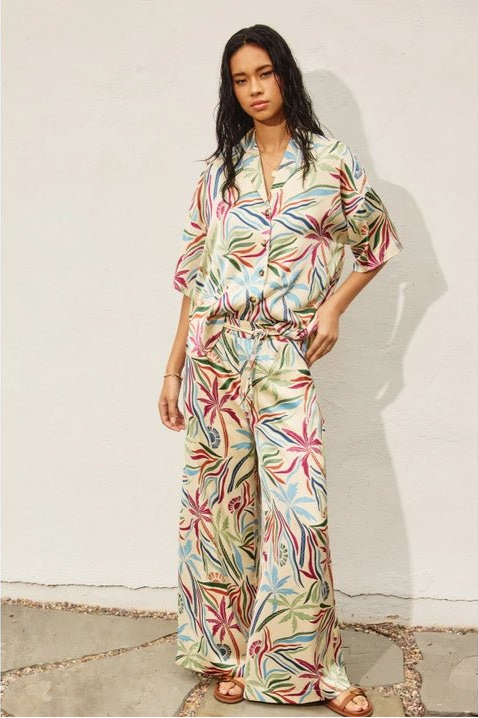 Printed satin wide leg pants. The editorial model is 5'8" and ecomm model are 5'11", 5'9". They are wearing size Small.
