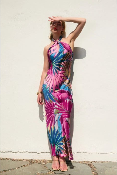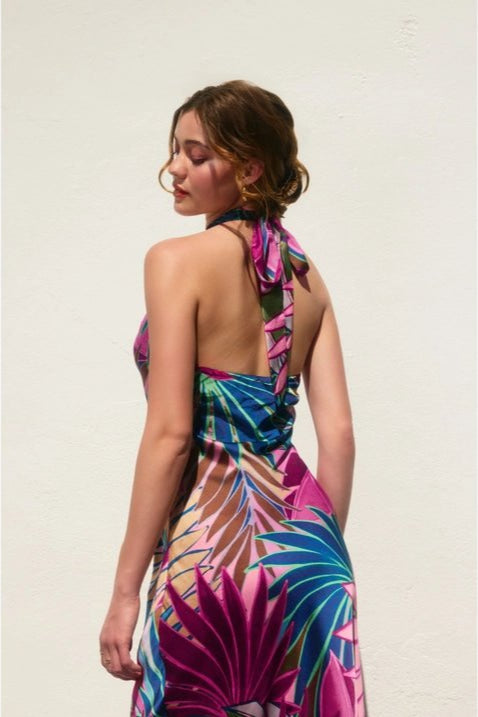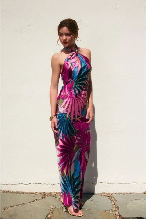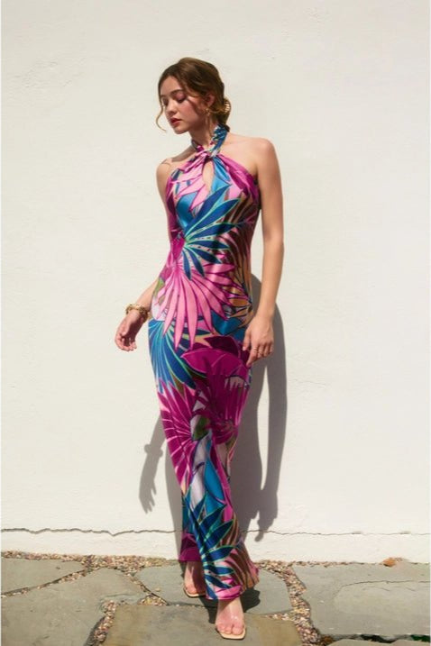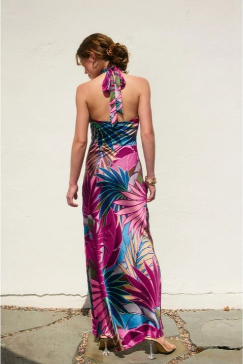 Tropical print maxi dress with an open back. Model is 5'6" and wearing size Small.