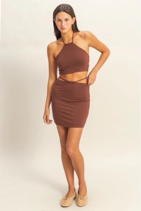 Paired With A Coordinating Mini Skirt Designed With Crisscross Flossed Straps That Wrap Around The Waist And Tie At The Back.