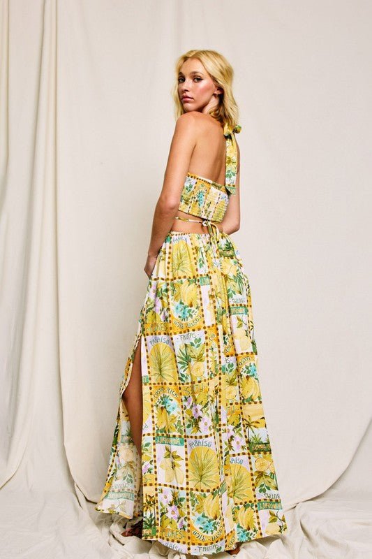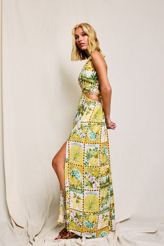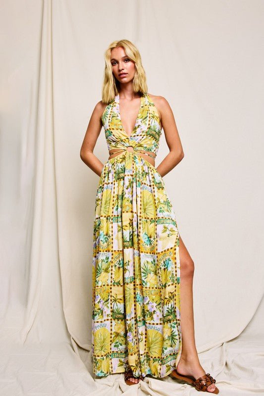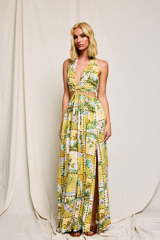 Vacation conversation print halter neck maxi dress with an O ring and cutouts.