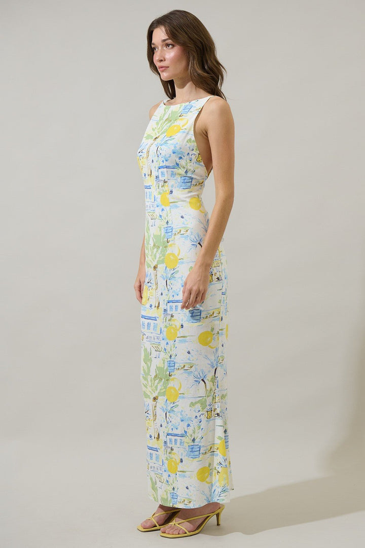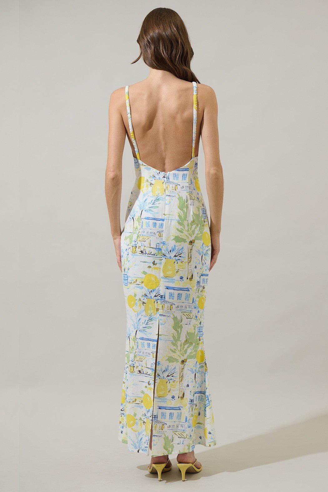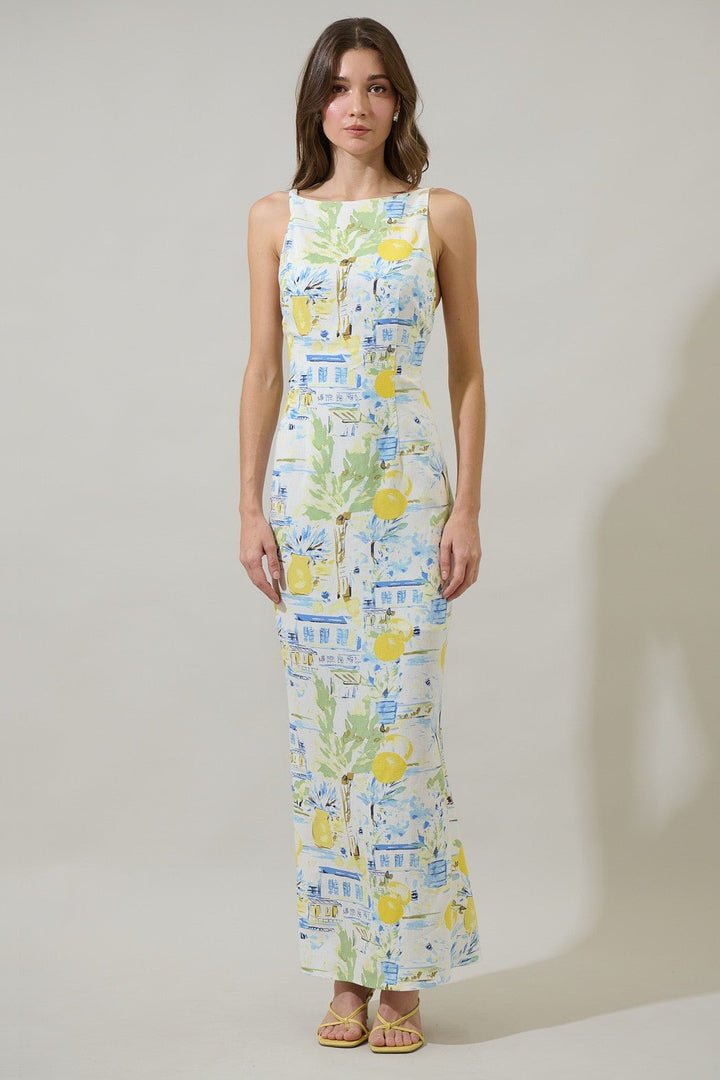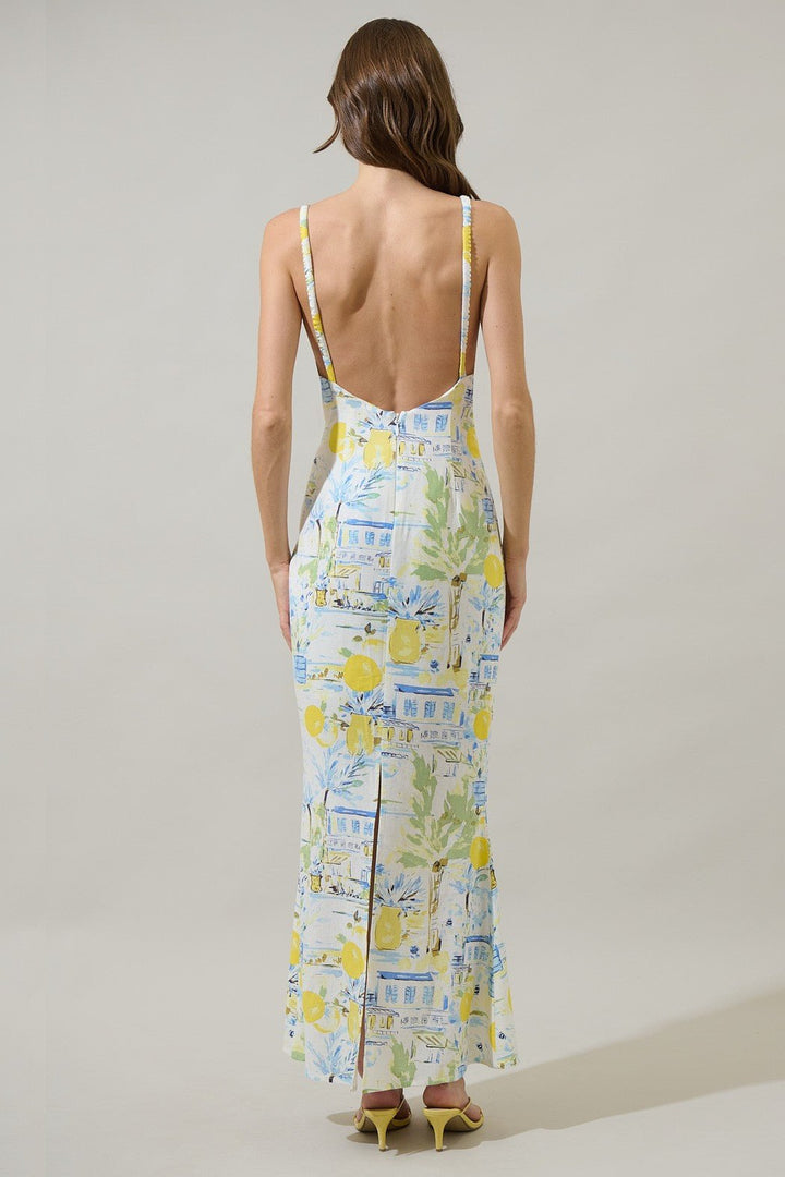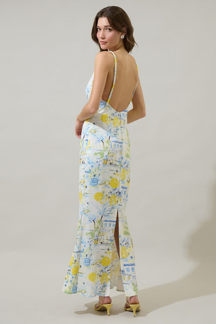 Elevate your style with the Italy Printed Open Back Maxi Dress. Featuring a flattering slit and an invisible zipper, this dress is perfect for any occasion. The relaxed fit and elasticized shoulder strap provide comfort and versatility. Available in a stunning blue mul color. Made with 75% rayon and 25% linen, with a 100% cotton lining. Model is 5'10" and wearing size XS.