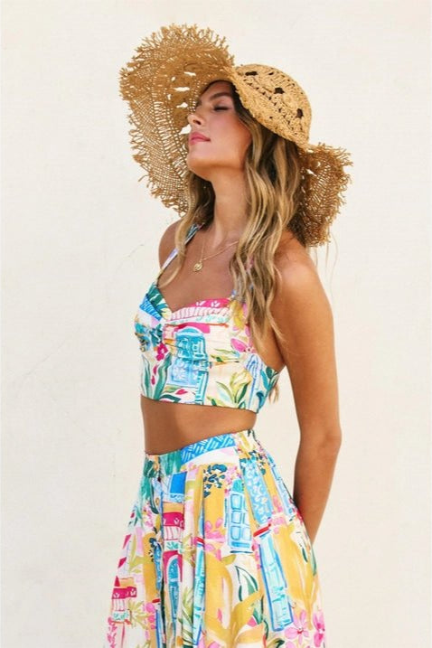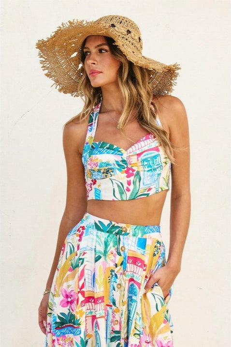 Summer print crop top with a halter neck. Model is 5'8" and wearing size Small.