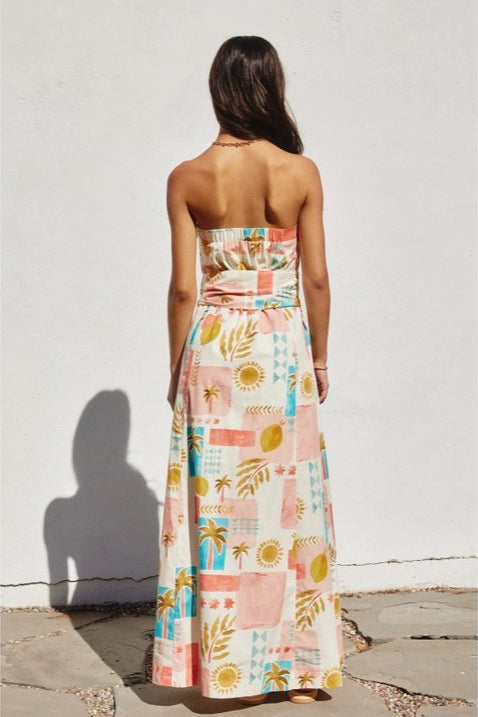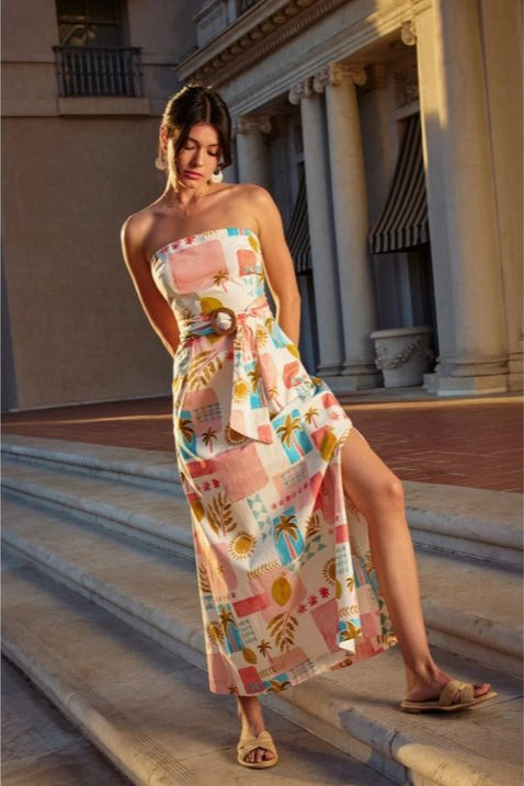 Cotton poplin printed strapless maxi dress featuring a rattan sash belt. The editorial model is 5'8" and ecomm model is 5'6". They are wearing size Small.
