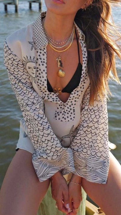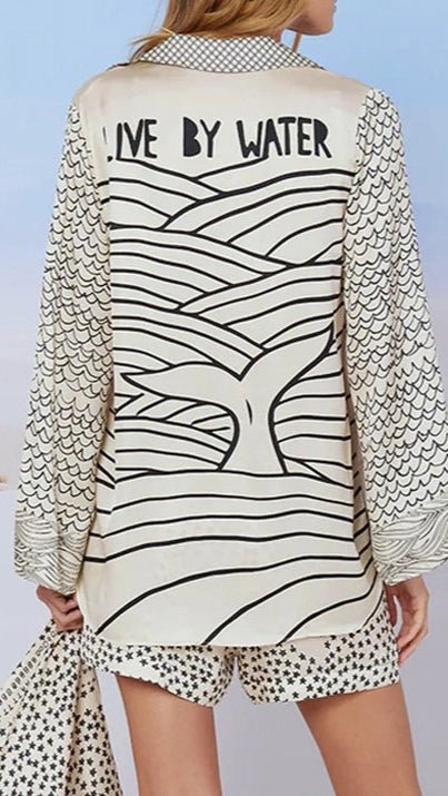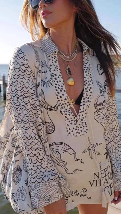 This vacation-ready top and shorts set is made from lightweight woven fabric with a relaxed, breezy feel—ideal for warm-weather getaways. Designed for adult women, the look features a long-sleeve V-neck top with tassel ties and a loose fit, paired with comfortable mid-rise shorts. The set is covered in black-and-white ocean-inspired illustrations including mermaids, suns, waves, and text prints like “Live by Water” and “I Need Vitamin Sea,” creating a playful and carefree aesthetic. Perfect for beachside walks, poolside lounging, or casual summer exploring, this set pairs effortlessly over swimwear or styled on its own for a chic coastal vibe.
