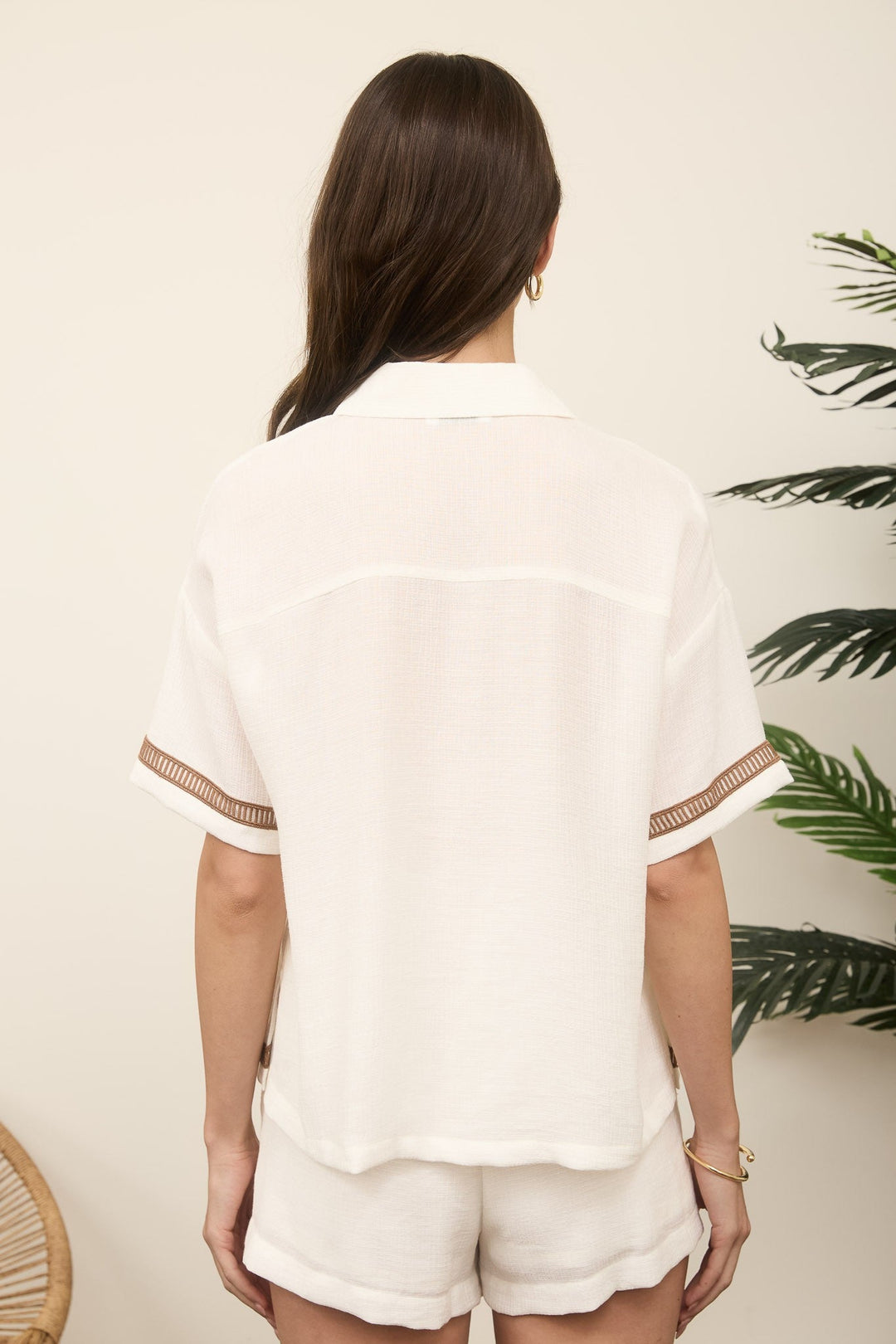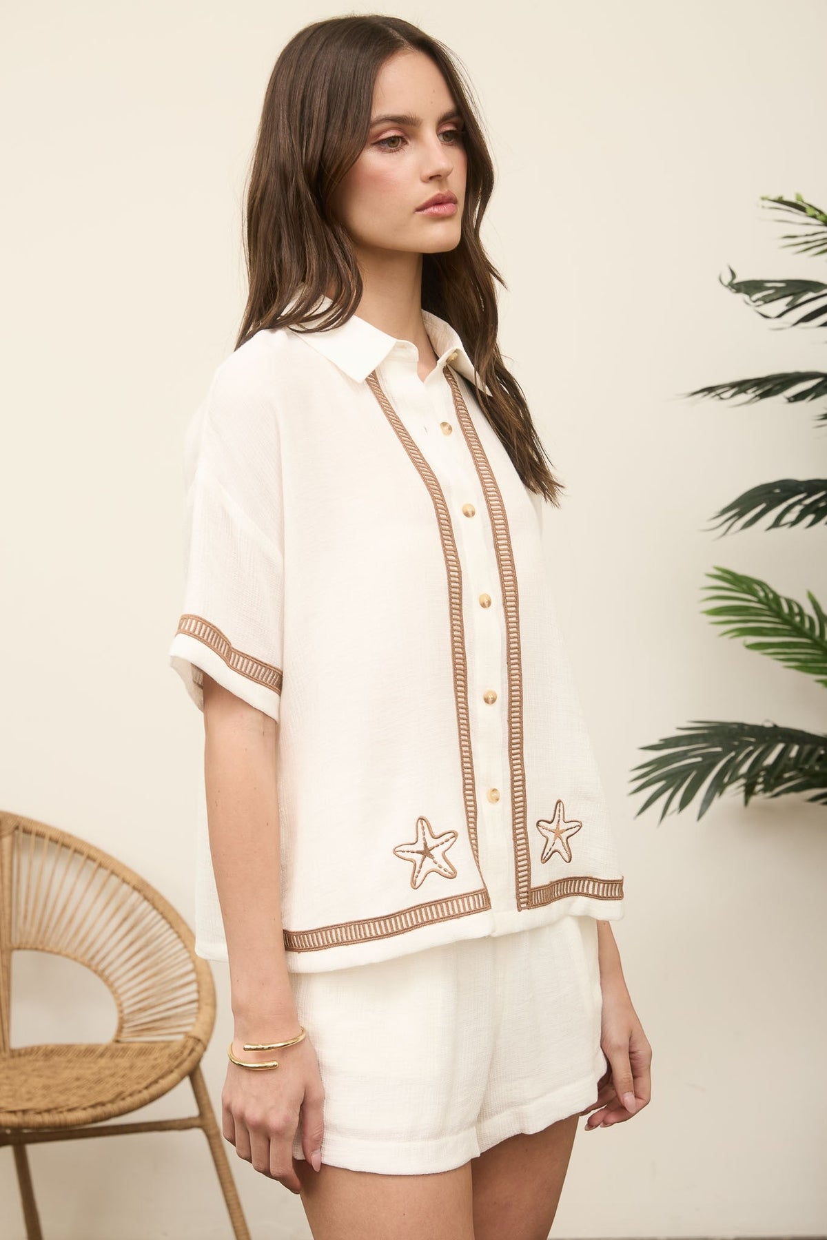 Add a coastal touch to your summer wardrobe with the Starfish Embroidery Detail Button Down Shirt. Crafted from a lightweight and breathable woven fabric, this relaxed-fit collared shirt features short sleeves, a full button front with gold-toned buttons, and charming starfish embroidery at the hem. Contrast tan trim along the sleeves and front placket adds texture and structure to this laid-back silhouette. Whether you're lounging beachside, exploring a resort town, or heading to a casual brunch, pair it with matching shorts or linen pants for the perfect breezy, vacation-ready look.