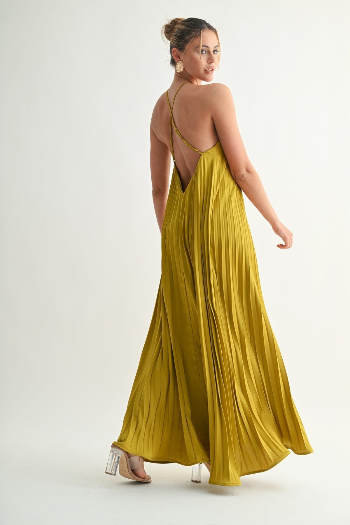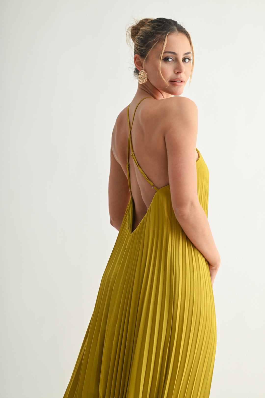Immerse yourself in the radiance of the Sun Ripple Pleated Maxi Dress. Its delicate adjustable straps and flowing, pleated silhouette create an elegant and effortless look. Fully lined and available in two stunning colors, it's the perfect choice for any occasion. Dress it up or down with minimal heels or strappy sandals. The Sun Ripple Pleated Maxi Dress moves like light. Designed with a flowing pleated silhouette, this maxi dress features delicate adjustable straps that crisscross at the back for an elegant open look. Fully lined for comfort, it drapes effortlessly for both casual and elevated occasions. Style it with minimal heels or strappy sandals for a dreamy, all-day ensemble.