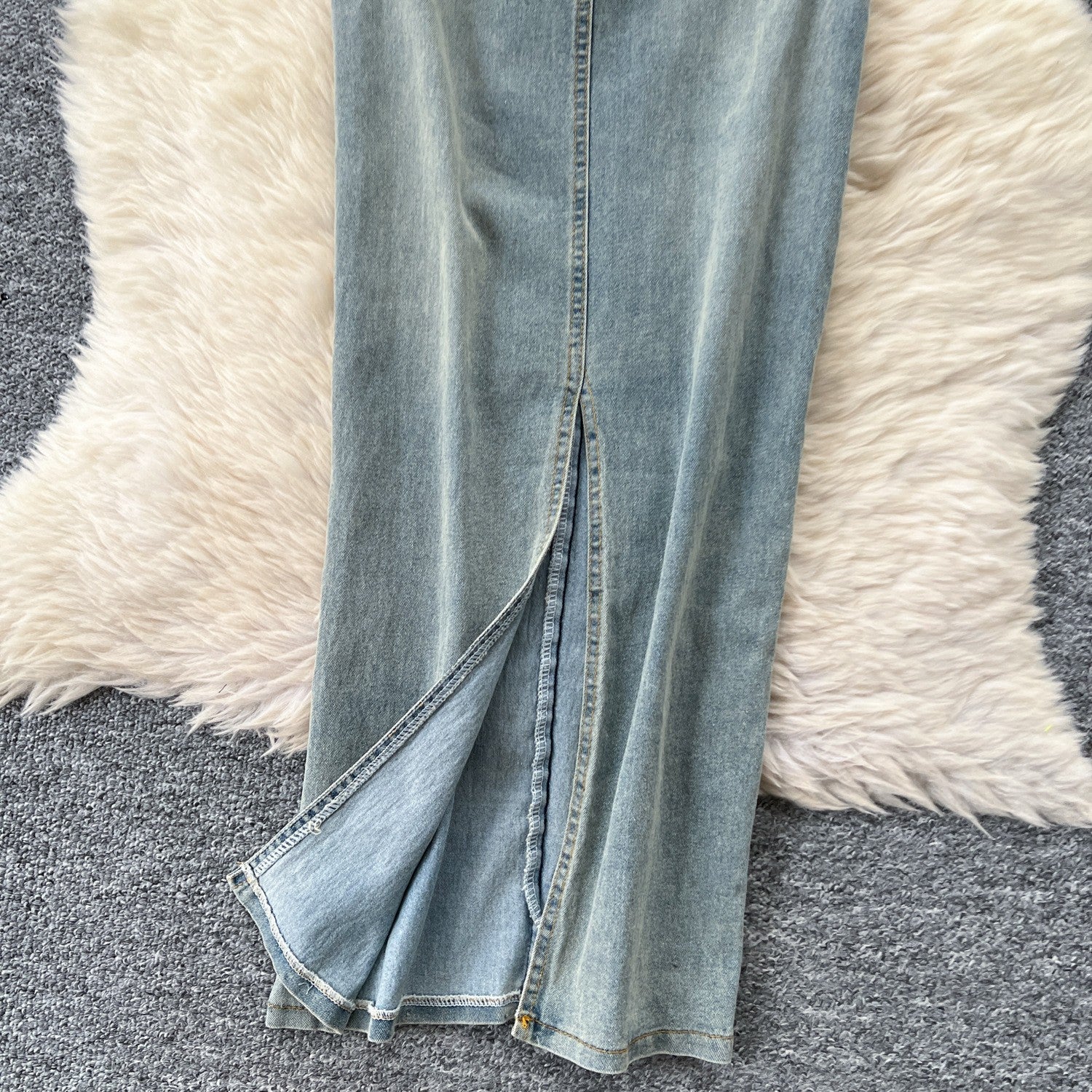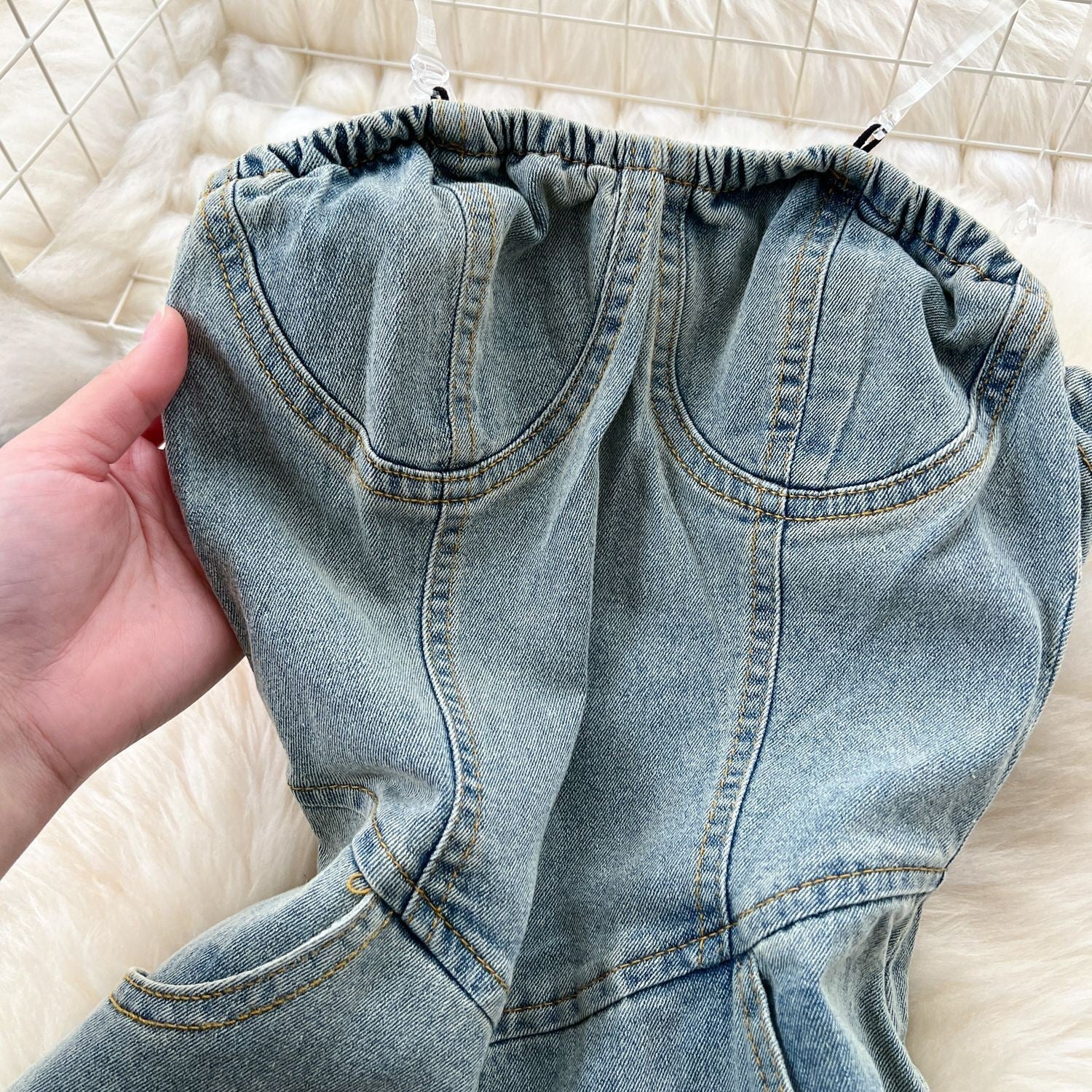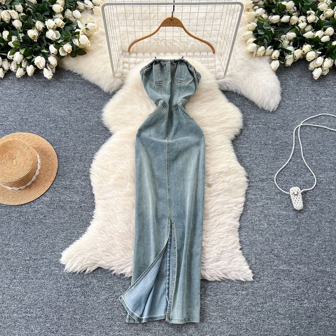 Elevate your denim game with this strapless denim maxi dress, designed to sculpt and flatter in all the right places. Featuring a structured, corset-style bust with defined seaming and elastic back detailing for added comfort and support. The floor-length silhouette flows into a chic front slit that adds movement and edge to every step. Perfect for a summer date night, a rooftop party, or a casual day styled with sneakers. Dress it up with heels and gold hoops, or down with sandals and a straw hat.