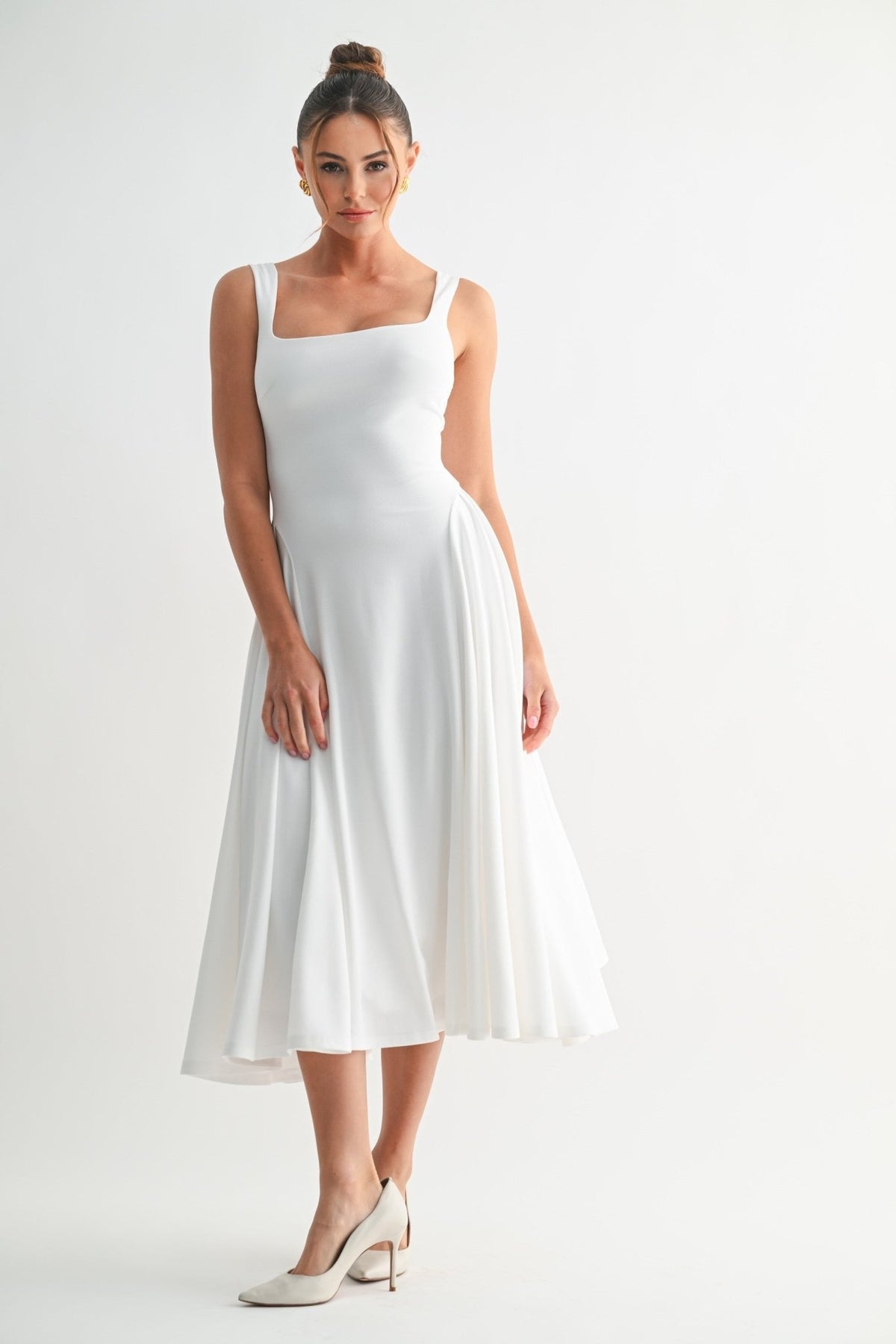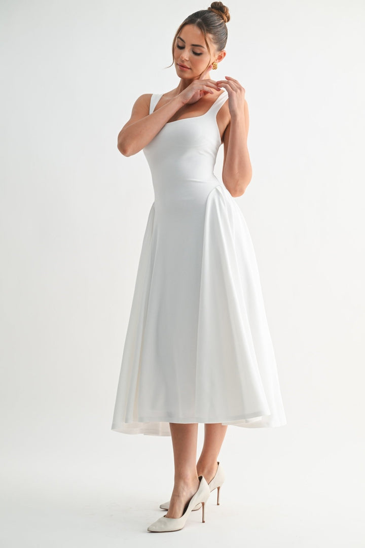 Timeless elegance with a modern touch. The Lyra Muse Midi Dress features a clean square neckline, wide straps, and a softly flared skirt that flows with effortless grace. Crafted with the perfect amount of stretch, this midi is ideal for bridal events, cocktail hours, or any occasion where classic beauty speaks volumes. A romantic silhouette designed for modern elegance. The Lyra Muse Midi Dress features a square neckline, adjustable shoulder straps, and a flattering fitted bodice that flows into a voluminous, pleated skirt. Finished with a discreet back zipper for ease, this piece effortlessly blends structure with movement.