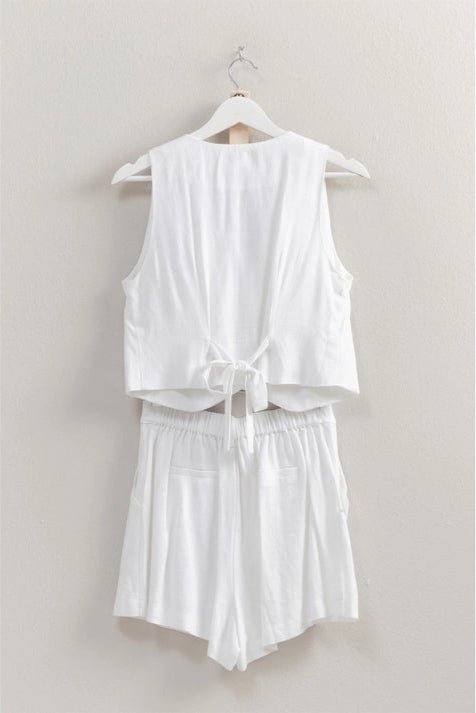 Polished and breathable, this linen-blend vest and shorts set is the ultimate warm-weather wardrobe staple. The tailored vest features a deep V neckline, tortoiseshell button front, and adjustable back tie for a customized fit, while the coordinating high-waisted shorts include an elastic waistband and practical pockets. This set combines modern suiting details with effortless summer styling—perfect for everything from brunch dates to vacation strolls. Available in white, light blue, and black to suit every mood and occasion.