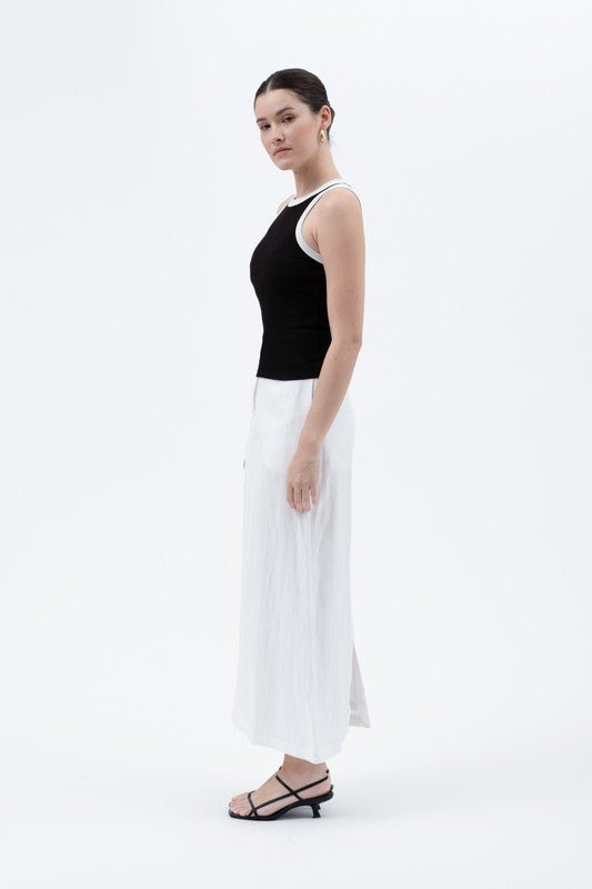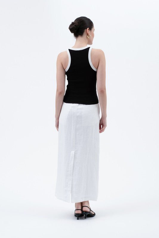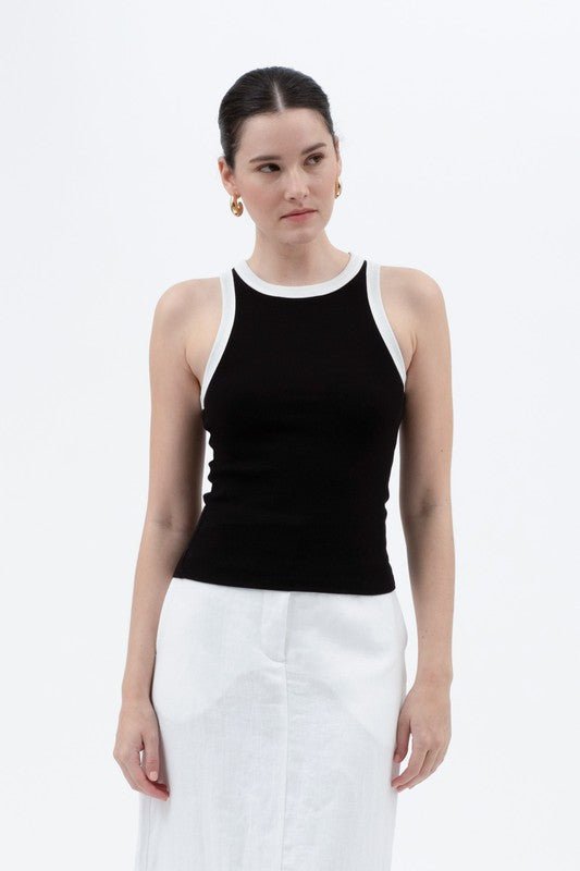 A bold twist on a timeless essential. This seamless ribbed tank features a flattering racerback cut and striking two-tone contrast trim for a sporty-chic aesthetic. Made from a soft, stretchy fabric that hugs the body comfortably, it’s the perfect layering or standalone piece for warmer days. Whether styled with tailored trousers, midi skirts, or laid-back denim, this top brings effortless edge to everyday looks. Available in two colorways: black with white trim and white with black trim.