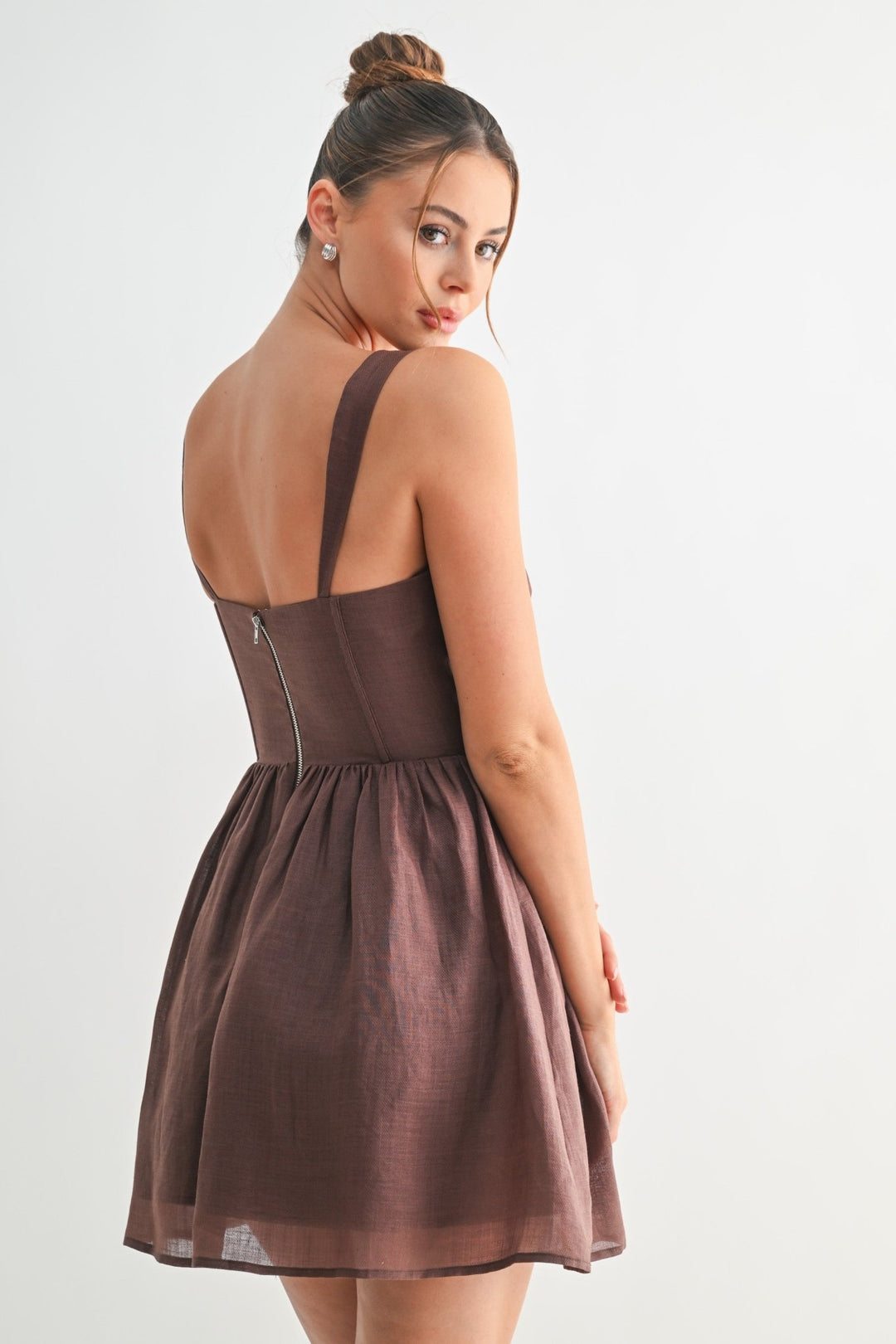 A flirty silhouette with romantic structure, the Willow Corset Mini Dress features a ruched bust with an adjustable tie front, thick shoulder straps, and visible corset seams that sculpt the waist. Its gathered skirt adds subtle volume while the back zipper ensures an easy fit.
