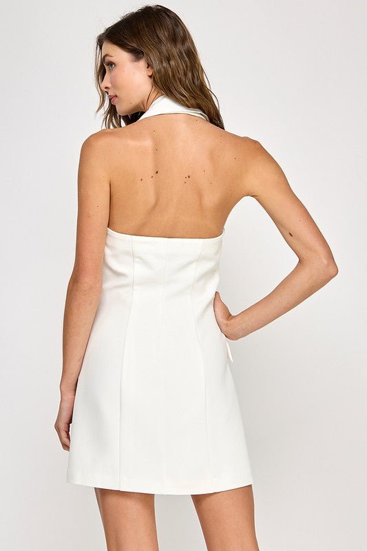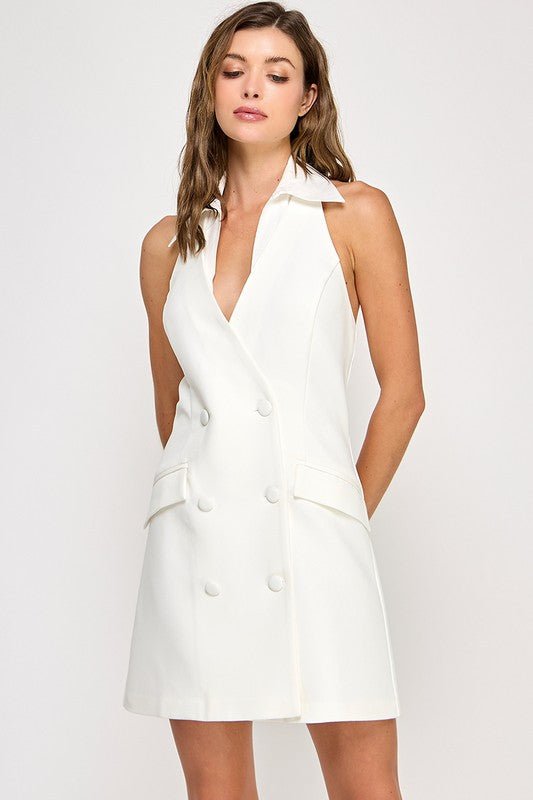 Command the room in our Tailored Power Sleeveless Blazer Dress — a bold, feminine take on classic suiting. Designed with a double-breasted front and sharp collar, this mini dress features a sleek sleeveless cut and a structured silhouette that cinches at the waist for a flattering fit. The back is elegantly strapless, giving it a contemporary edge that's perfect for modern brunches, bridal events, work meetings, or cocktail nights. Available in crisp ivory and classic black, this versatile piece transitions effortlessly from day to night. Pair it with strappy heels and gold jewelry for a polished look, or keep it sleek with pointed-toe flats and a statement clutch.